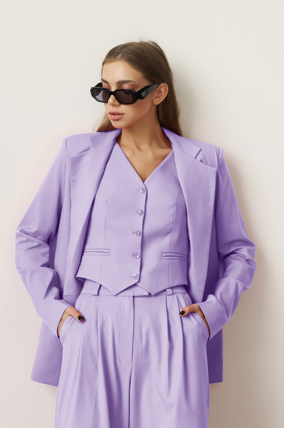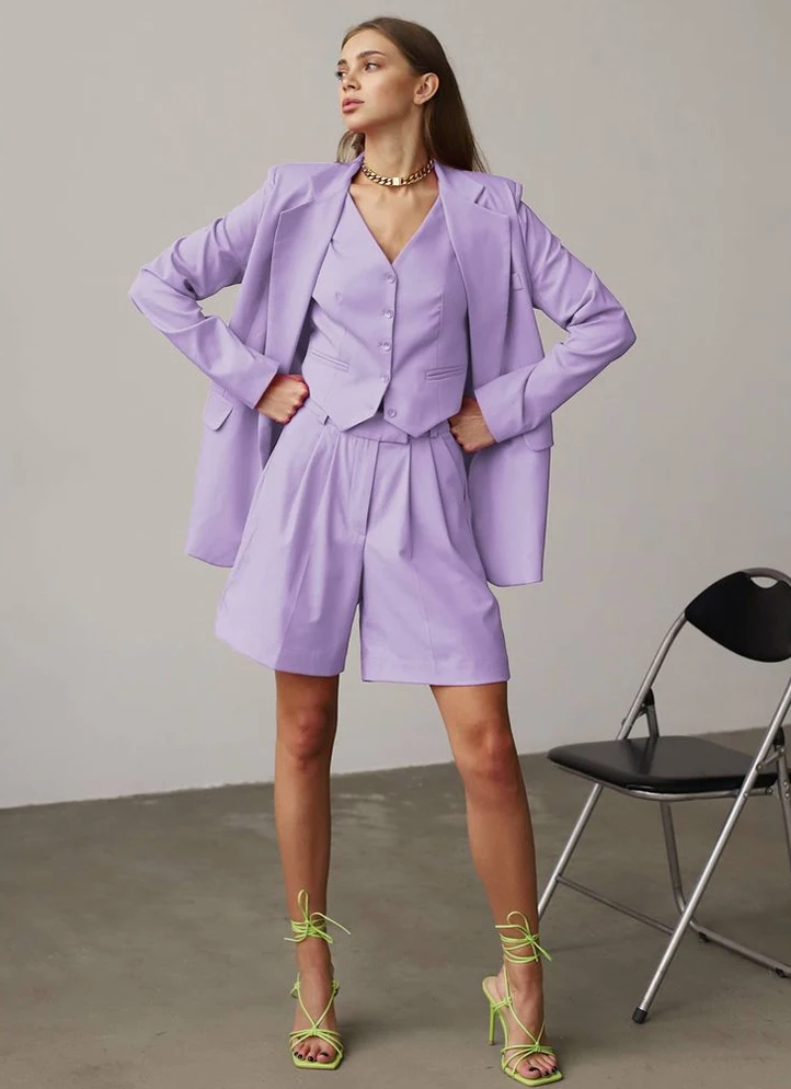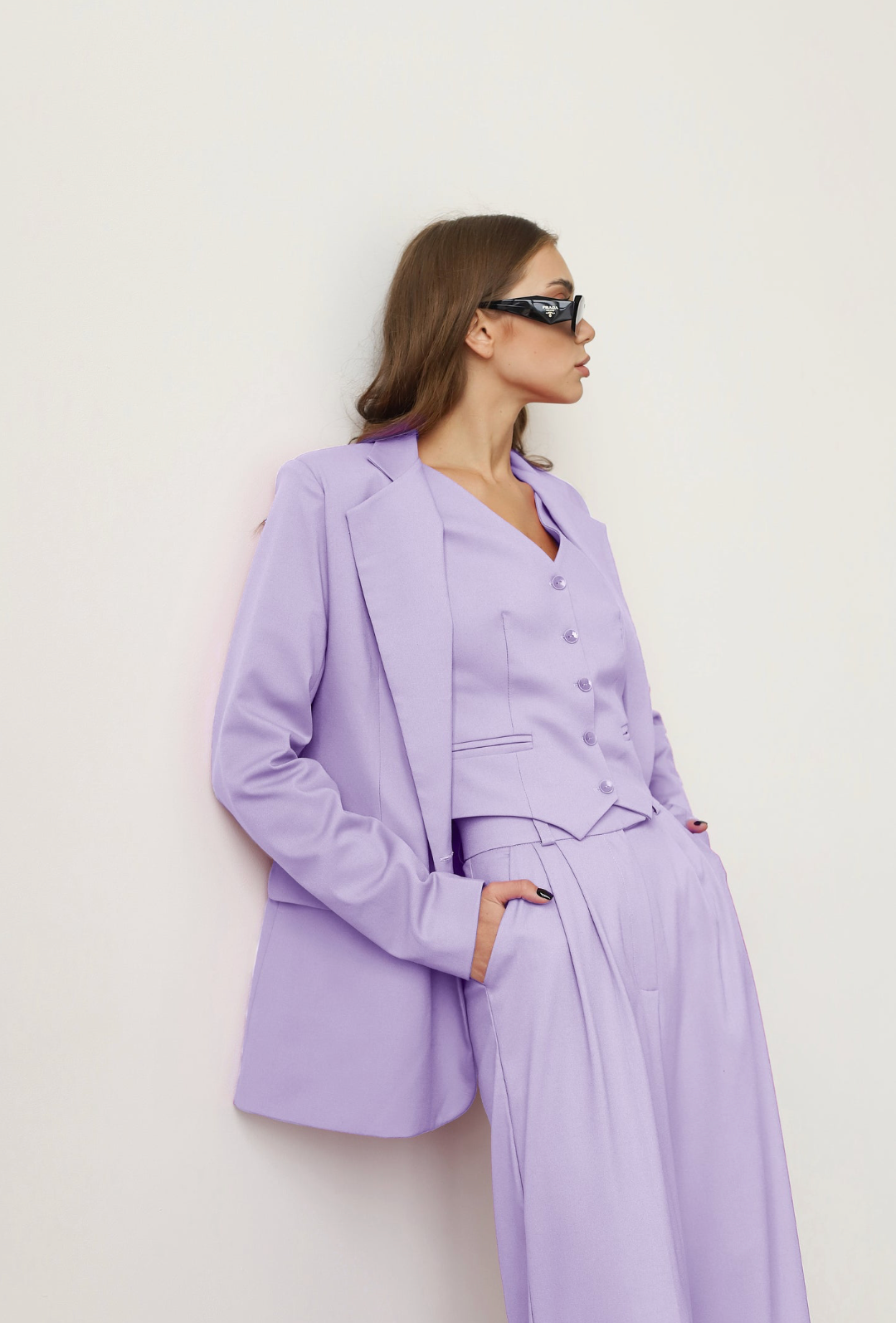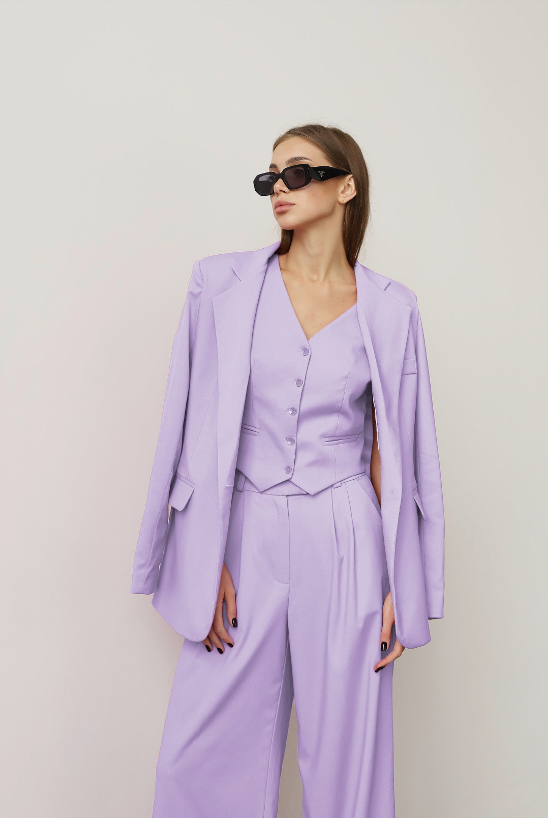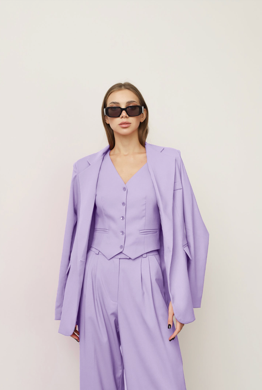 Embrace bold sophistication with The Stanley Suit Set. Enjoy the luxury of the three-piece outfit featuring a loose-fit single-breasted blazer. It has a matching vest, wide leg pants, and a zipper fly. Designed with a sharp collar and buttoned details, this suit offers a fearless blend of style and comfort, perfect for the modern office woman ready to make a statement.