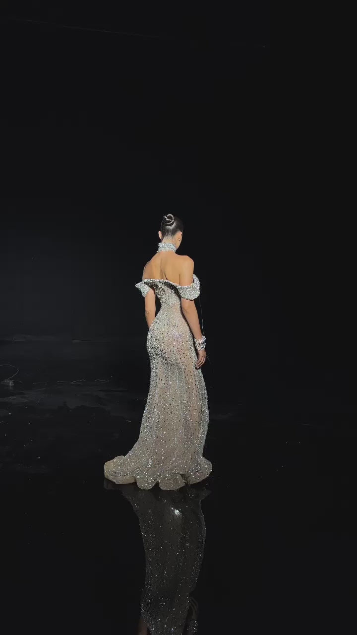 Command the room in the Lionheart Gown, a daring blend of opulence and allure. This floor-length evening dress dazzles with glittering beads and rhinestones that highlight its seductive v-neck and off-the-shoulder design. The figure-hugging mermaid silhouette and customizable fit ensure you stand out at weddings, parties, or proms. Crafted from cotton, polyester, and tulle, this sleeveless gown with a court train is your ultimate statement of fearless elegance