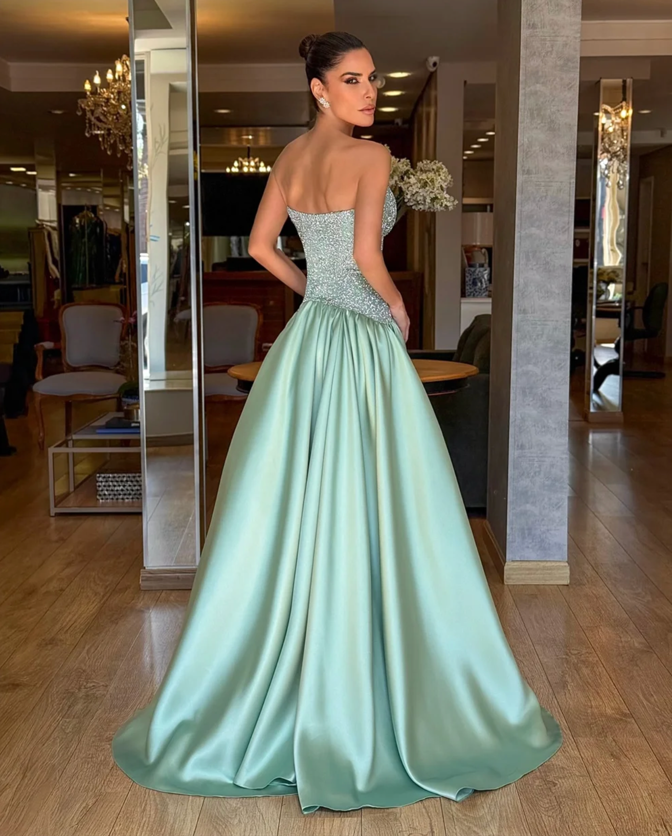 Nireya commands attention with its fearless design—a shimmering sequin masterpiece that catches every light on the dance floor. This strapless, backless A-line silhouette delivers pure glamour with its floor-length flow and sleeveless cut, perfect for those ready to make a bold statement at prom or formal events. The daring open back and sequin detailing create an unforgettable look that refuses to blend in.
