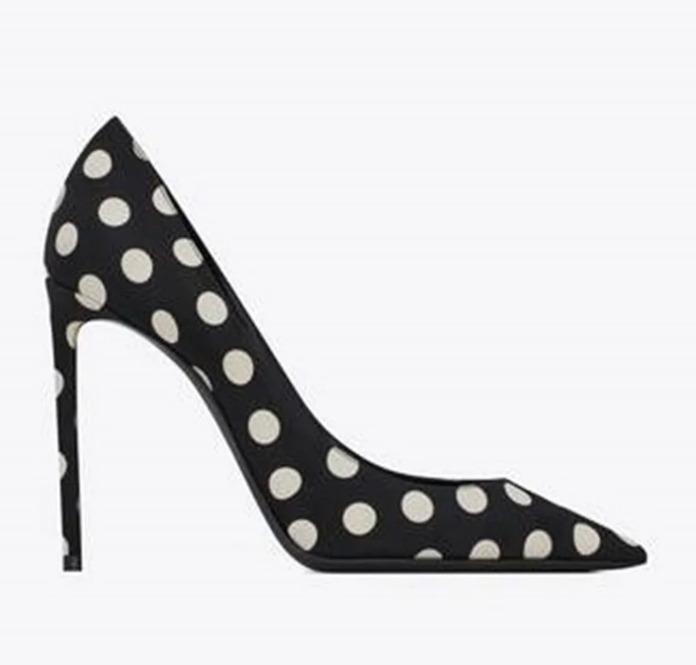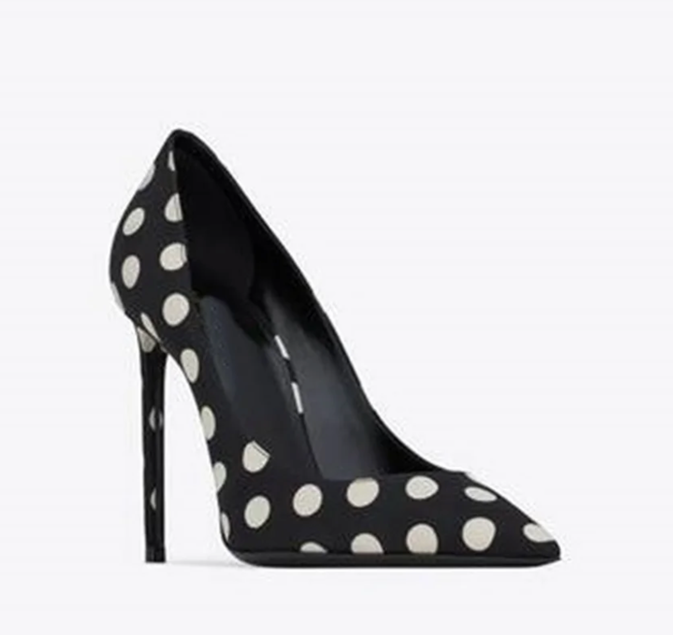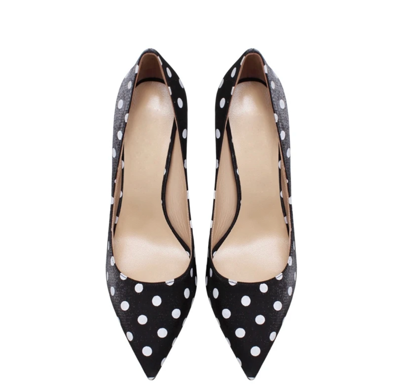 Elevate your ensemble with our Sestieri Pumps, featuring an elegant polka-dot print and sophisticated pointed toe silhouette. The covered stiletto heel adds height with refined grace, while the low-cut vamp elongates the leg for a flattering effect. These meticulously crafted high heels transition effortlessly from professional settings to evening affairs with timeless charm.