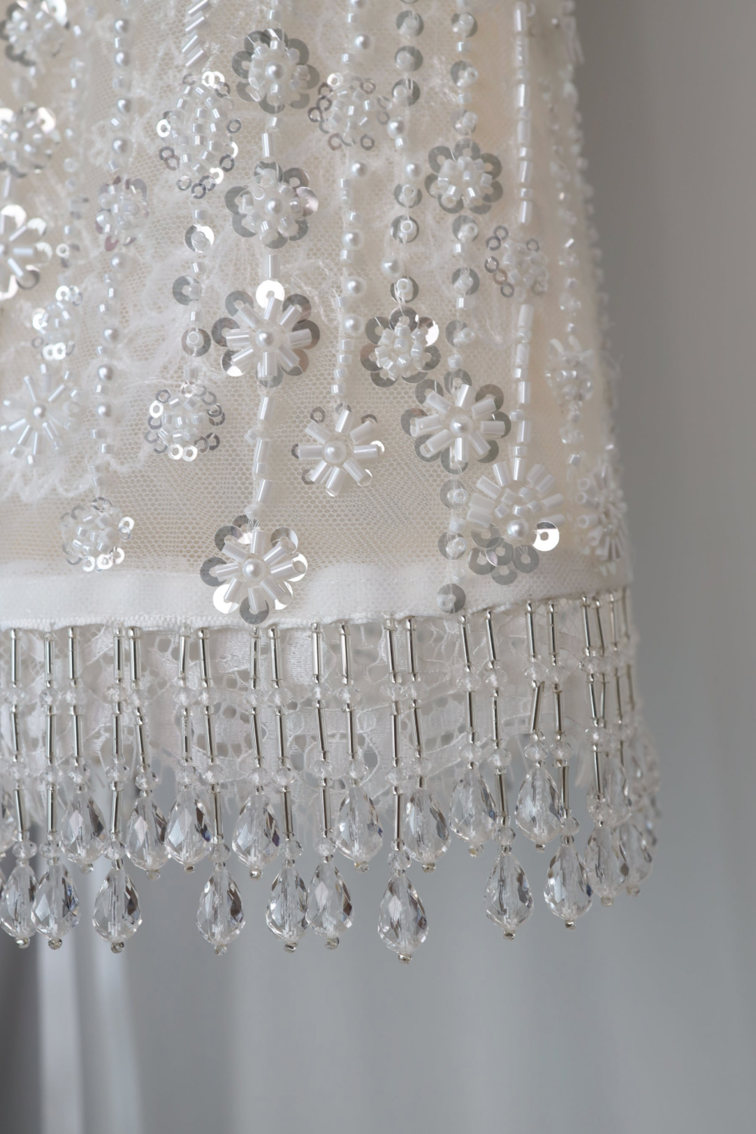 Moorea Mini is a bold statement piece that commands attention. This daring mini wedding dress features a striking square neckline and shimmering sequin lace that catches every light. Spaghetti straps with subtle sheer detailing add an alluring touch, while the corset-style lace-up back creates a sculpted silhouette.