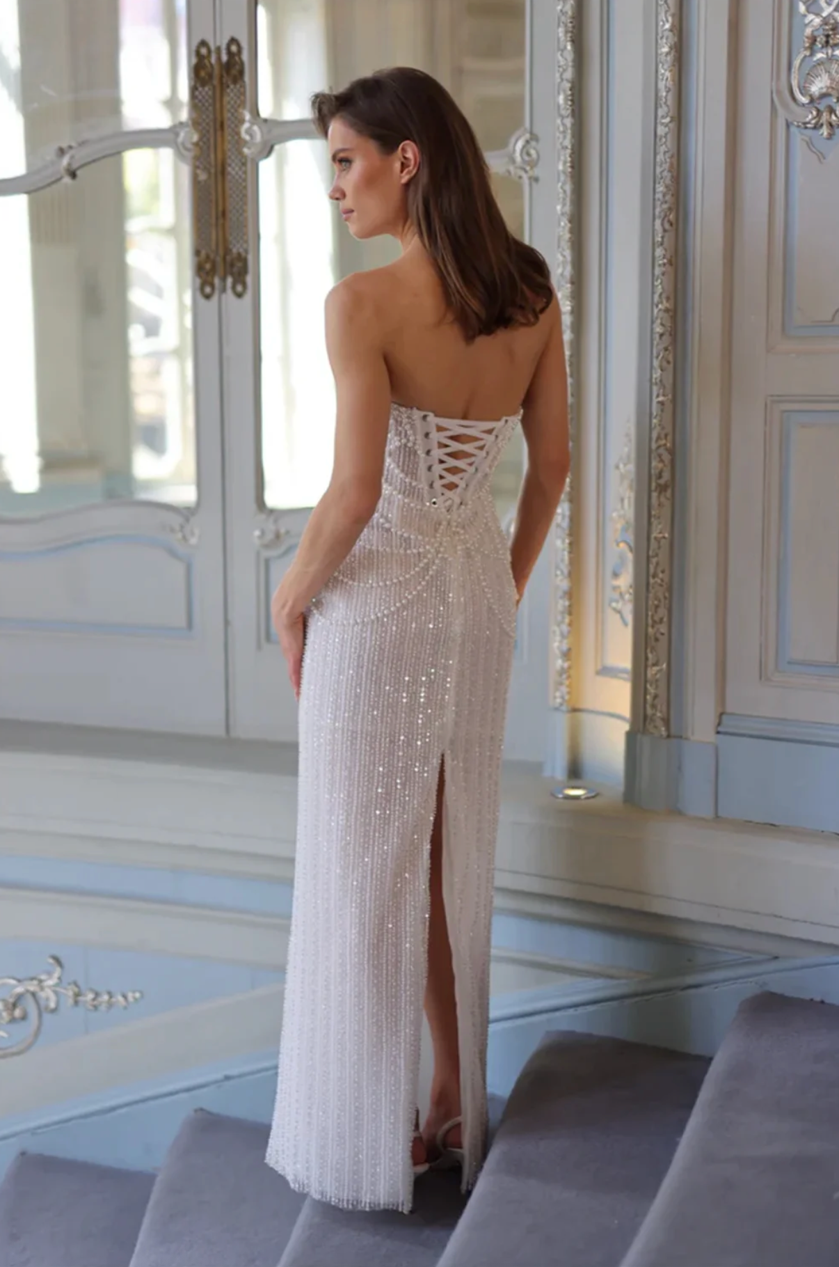 Betagne Maxi commands attention with its fearless elegance. This strapless column gown features shimmering ivory sequins that catch every light, paired with intricate pearl beading for undeniable glamour. The sleeveless silhouette showcases delicate sheer detailing, while the lace-up back adds an alluring touch of sophistication. Floor-length construction and refined tailoring make this the ultimate statement piece for weddings, formal galas, and unforgettable evenings where you refuse to blend in.