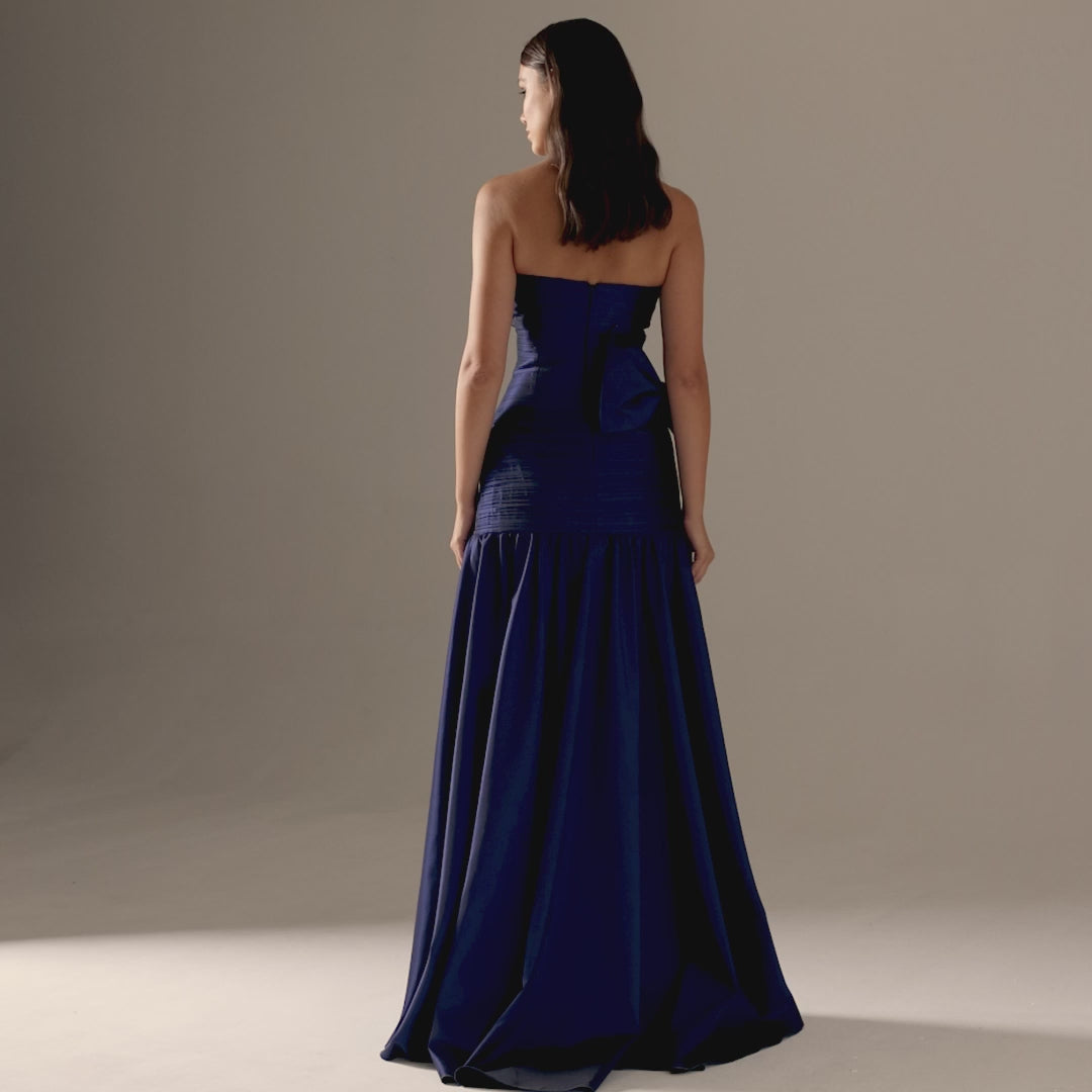 Make a bold statement in the Candelaria Gown, a strapless A-line evening dress designed to captivate. Its draped and pleated fabric flows gracefully to the floor, while the dramatic big bow at the back adds a daring touch to the backless silhouette. Perfect for prom or any party where you want to stand out with elegance and confidence.