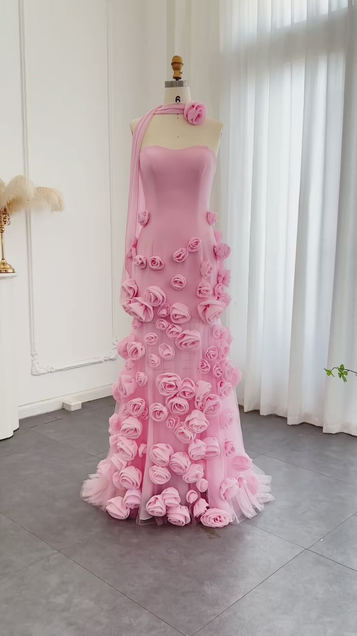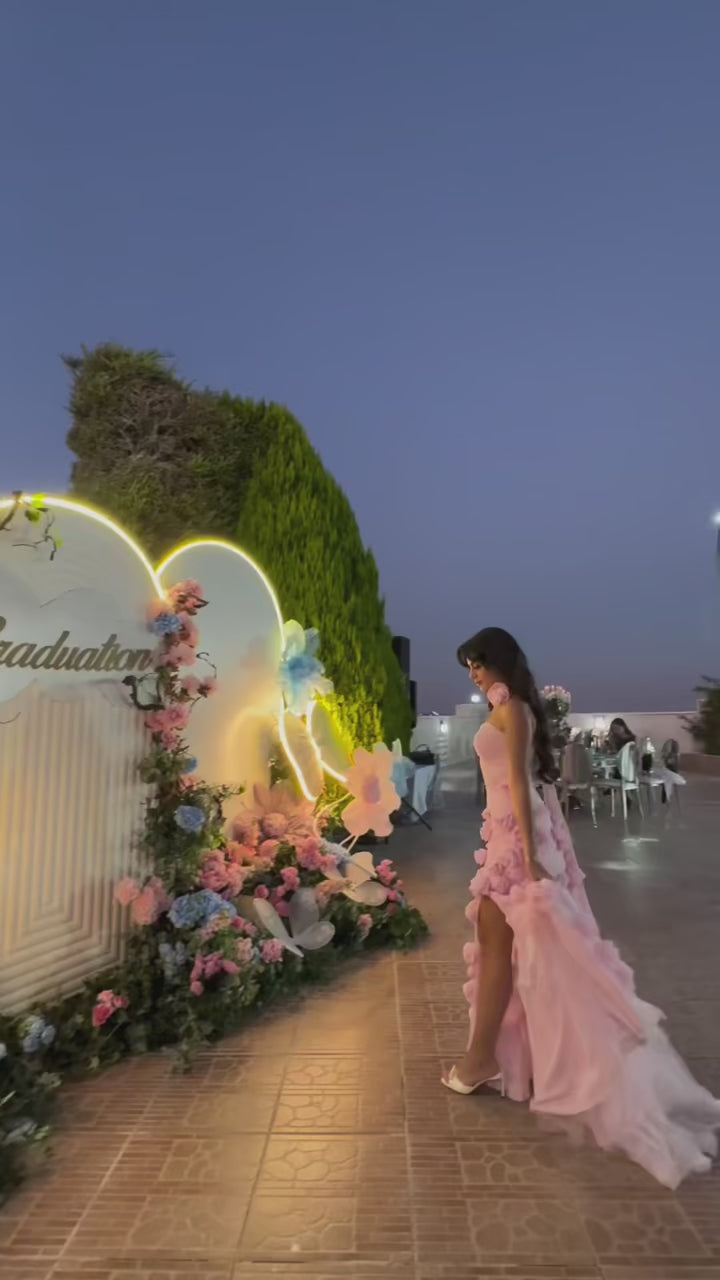 Embrace bold elegance with the Evelyn Walk Gown. Featuring a seductive sweetheart neckline and a daring side slit, this gown commands attention. The intricate 3D floral appliqués add a playful yet fierce touch, perfect for making a statement at any prom or party. Designed with a trumpet silhouette, sweeping train, and illusion details, this gown lets you unleash your inner goddess with confidence and style