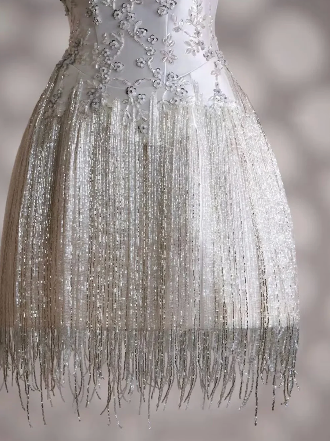 Regent Eyre captures bold elegance in a strapless silhouette that commands attention. This white mini dress features delicate lace-up detailing down the back, a daring neckline, and sleeveless cut that showcases confidence. The above-the-knee length offers modern sophistication without compromise—perfect for the woman who refuses to play it safe. Timeless white fabric meets contemporary design for a statement piece that's unmistakably yours.