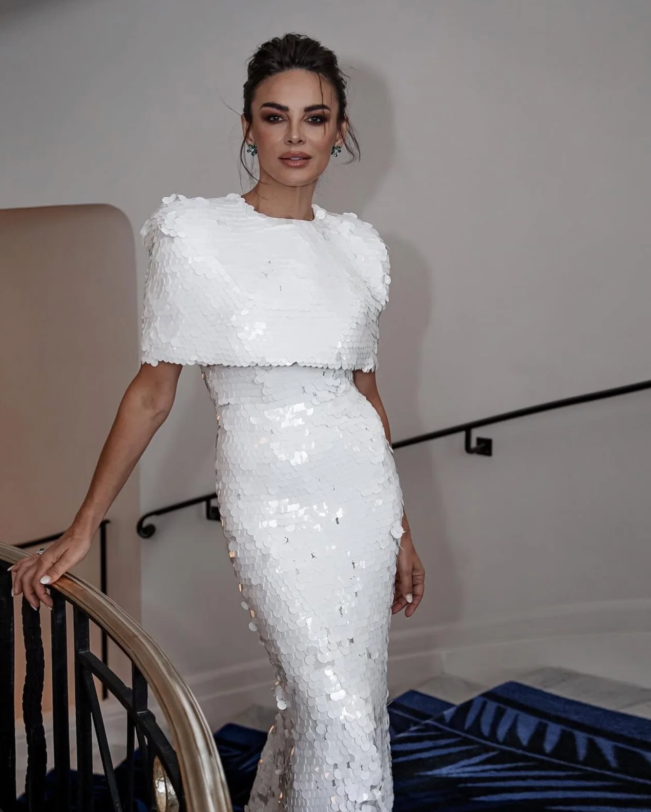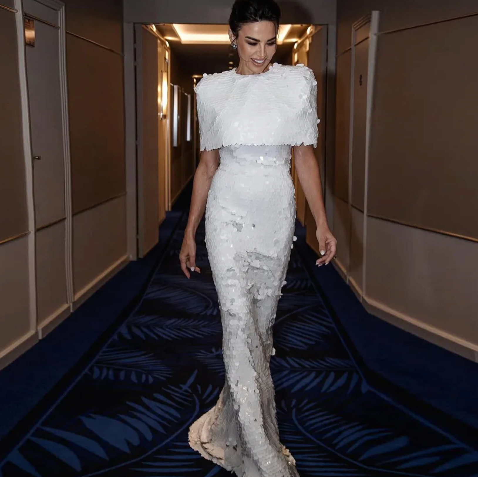 Slip into pure glamour with the Romulus Evening Dress—a showstopping gown that turns heads at every formal affair. Adorned with shimmering white sequins that catch the light with every movement, this elegant piece features a dramatic cape that adds an extra touch of sophistication and flair. Perfect for prom nights, galas, and luxury celebrations, this dress combines timeless elegance with modern drama. Whether you're making a grand entrance or dancing the night away, you'll feel like the star of the show in this stunning formal gown.