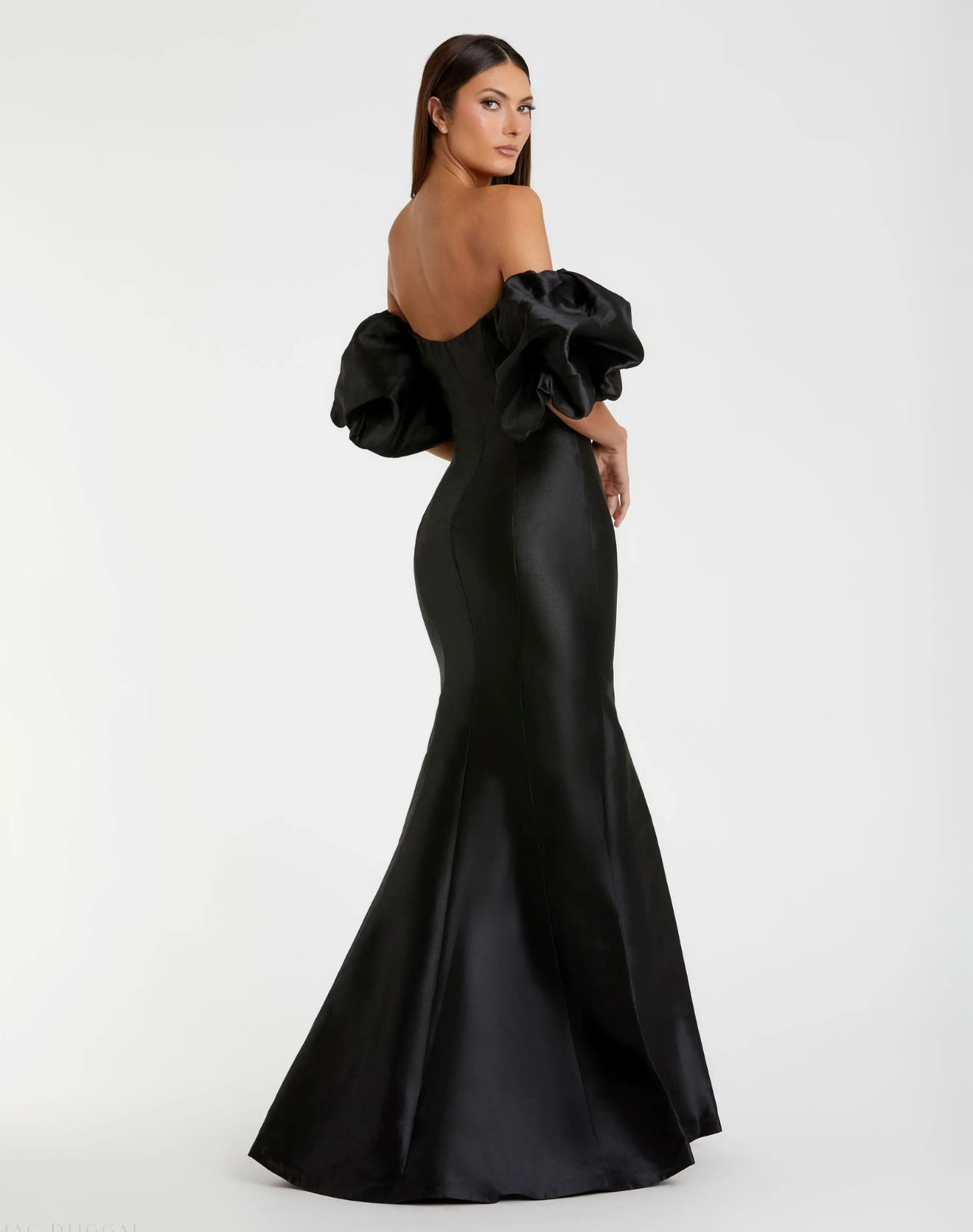 The Toulouse seizes attention with its bold off‑the‑shoulder silhouette and dramatic puff sleeves that insist on being seen. Crafted from luxurious satin, this gown refuses to whisper—it declares. The sweeping train trails behind you like a statement, creating a silhouette that's both timeless and unapologetically daring. Perfect for those ready to make an unforgettable entrance.