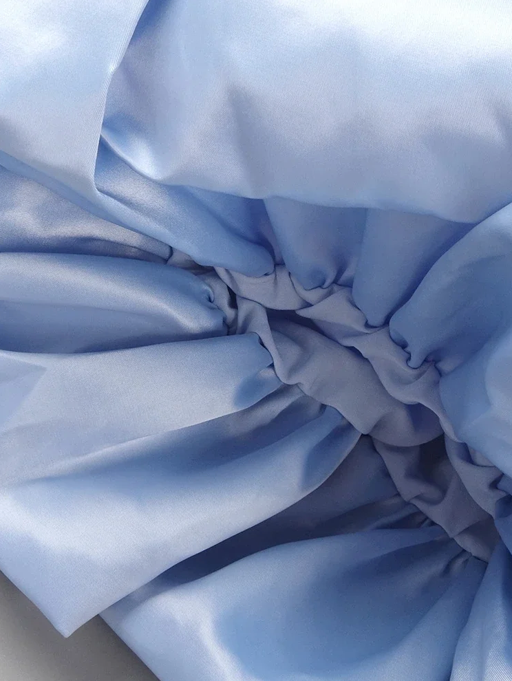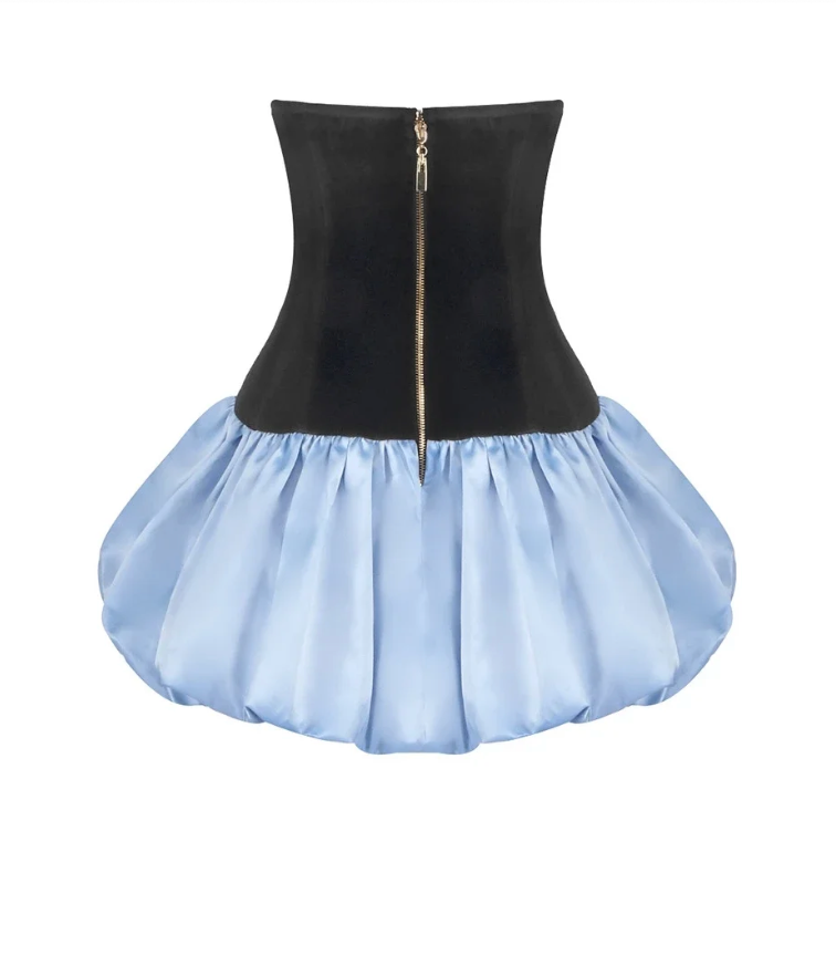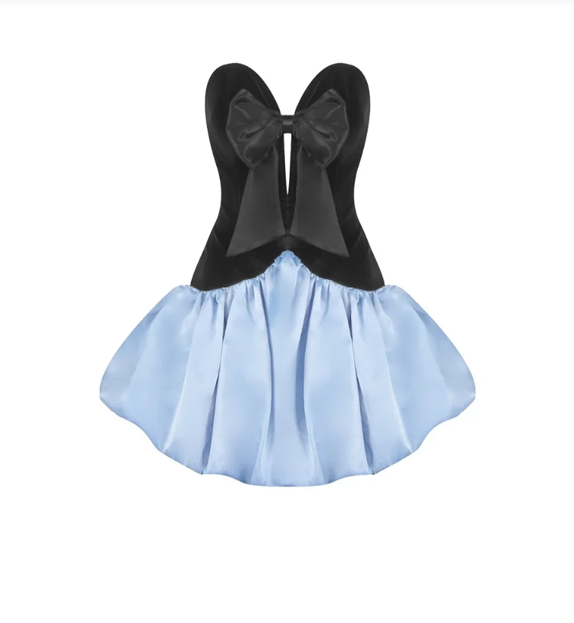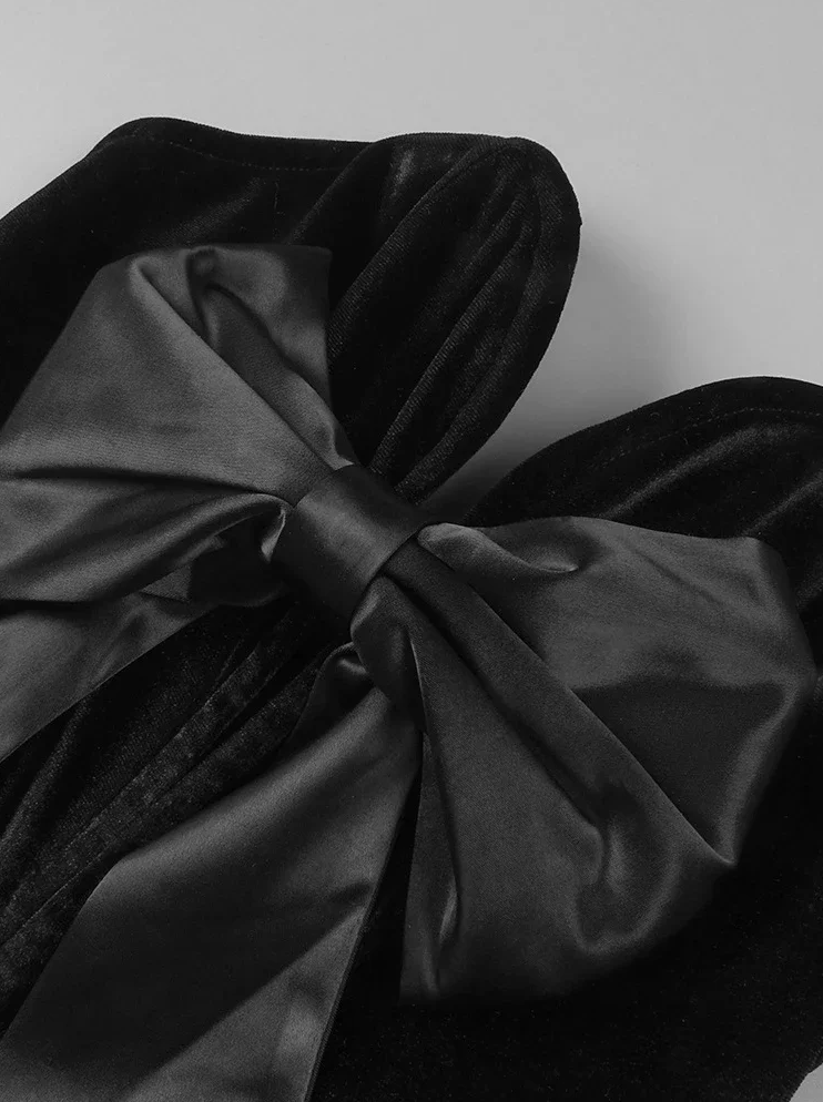 Turn heads in the Water View Mini, a daring strapless design that commands attention. This sleek black velvet mini features a bold hollow-out detail and signature bow embellishment that elevates your silhouette.